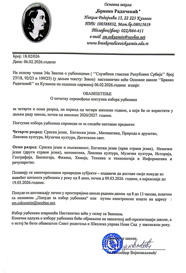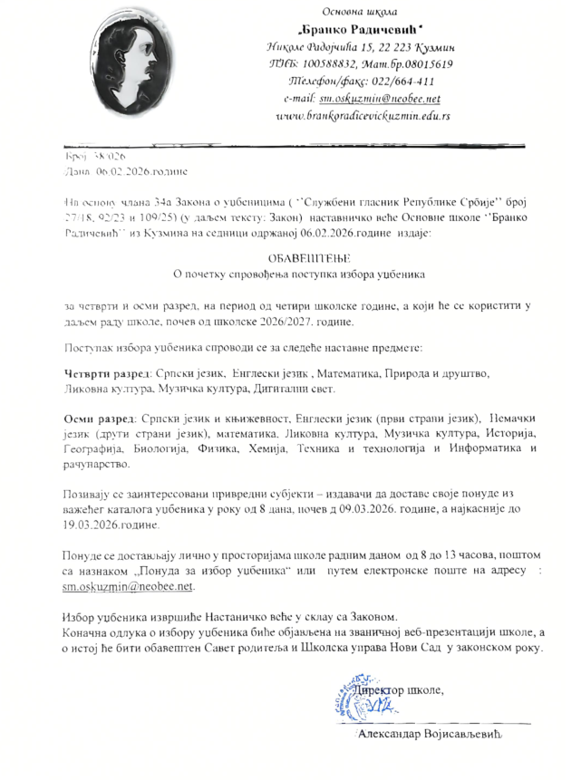 Обавештење о почетку спровођења поступка избора уџбеника